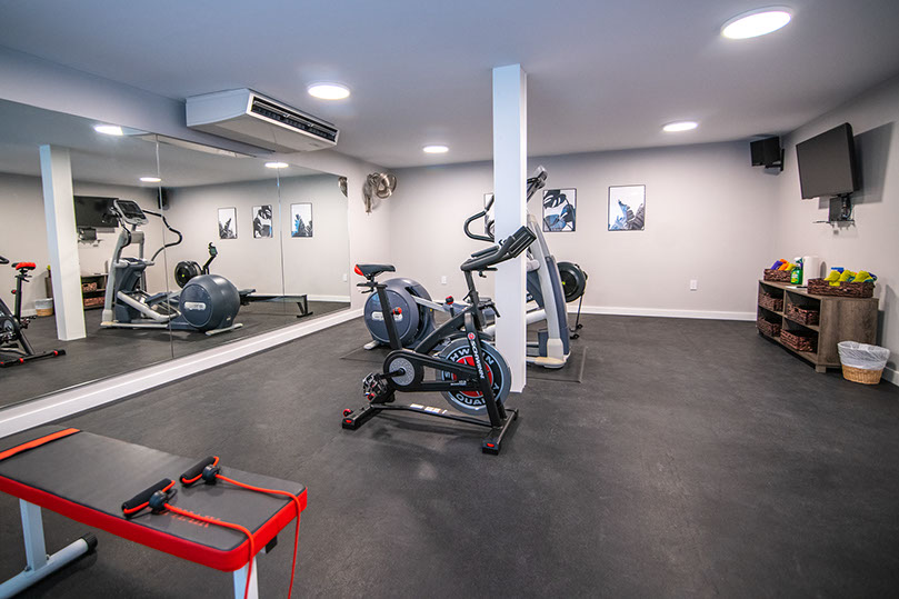 Upon request, you can access a rowing machine, bike and elliptical for your workouts. Light free weights, mats and bench round out your workout. Use the –“ TV or the MusicCast sound system to motivate your workouts.