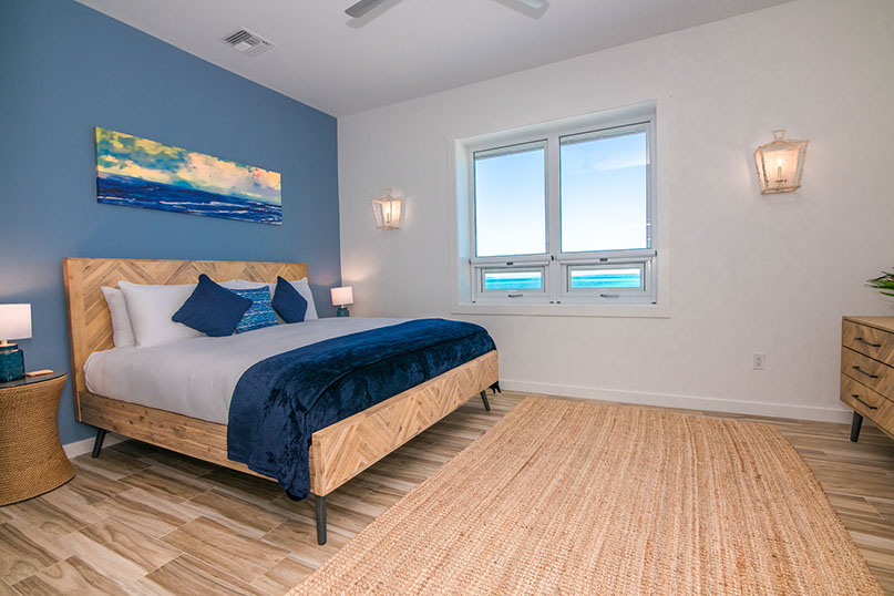 The sunrise room is an oceanfront bedroom on the main level and has a walkout to the deck. It is the
