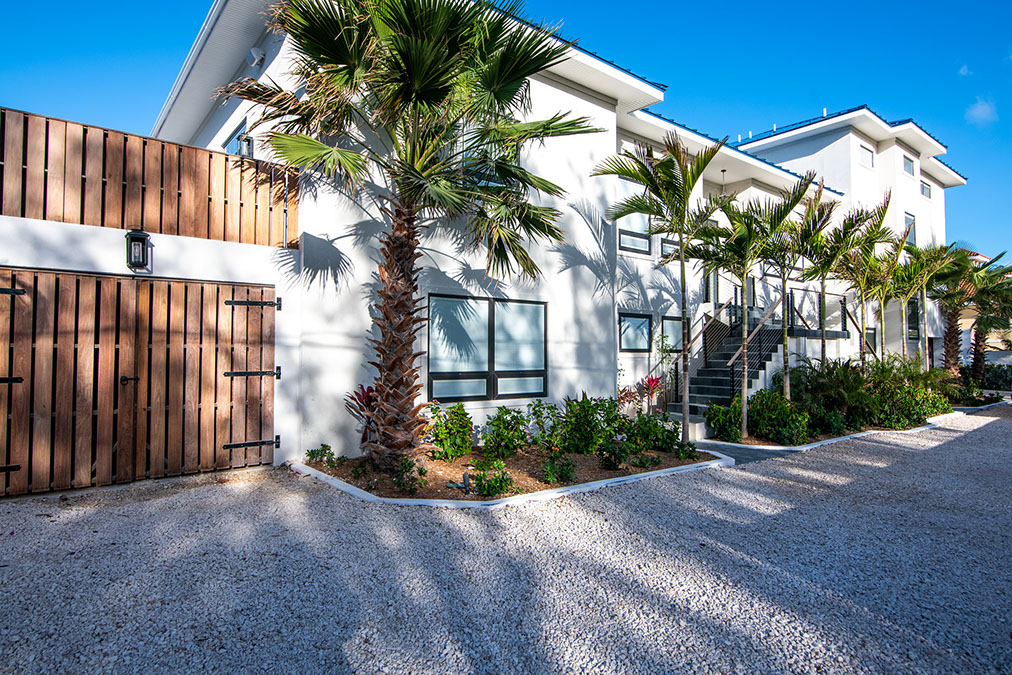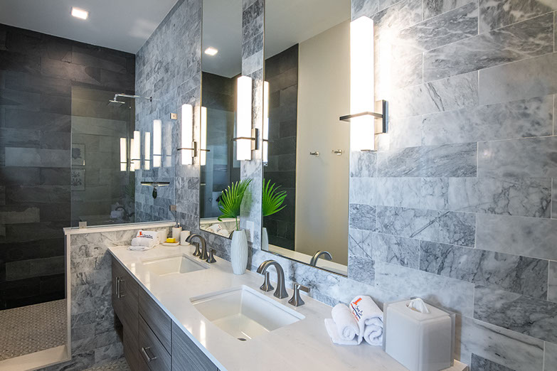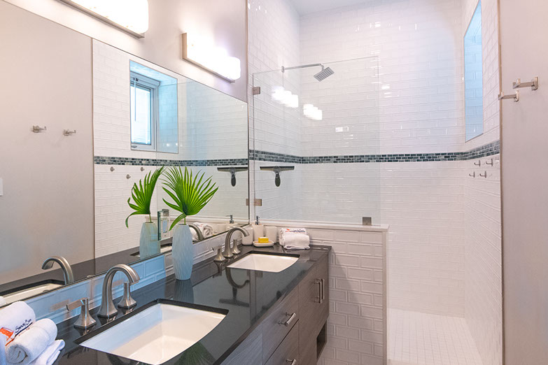 Each ensuite in the main house has a double sink vanity with custom cabinets, marble counter and modern fixtures. Enjoy the modern walk-in shower tiled with marble and slate (or fun tile and colored glass accent in the bunk room). Sandy Bum supplies Tommy Bahama bath products for your convenience.