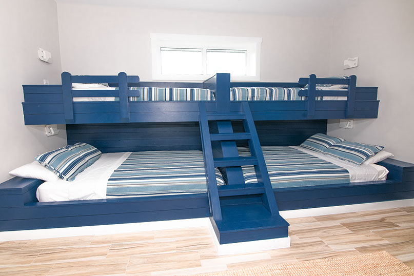 This large room has two twin beds over 2 queen beds. Each bed is equipped with its own light and